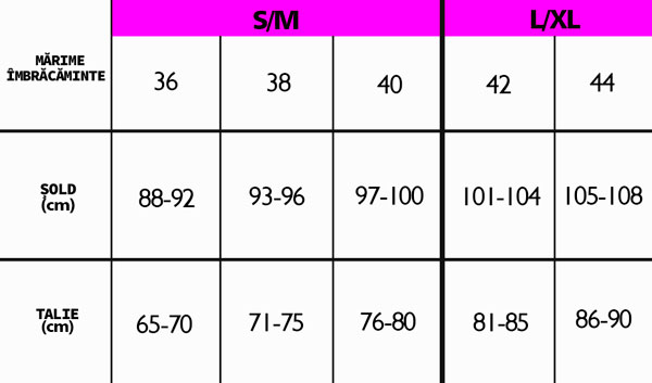 - Mărimi: S/M (60-73 kg), L/XL (74-95 kg)