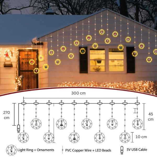 Luminile delicate și strălucitoare, plasate cu grijă în inele transparente, generează o atmosferă încântătoare, în timp ce aruncă o strălucire radiantă asupra figurinelor suspendate.