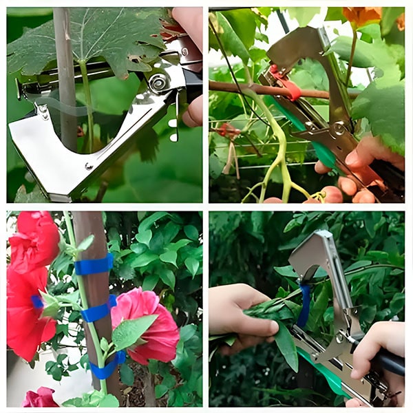 Pur și simplu împingeți mânerul pentru a întinde cureaua între clești. Banda este apoi înfășurată în jurul plantei pe care doriți să o legați. Împingeți din nou mânerul pentru a strânge și a tăia banda. Foarte usor! – nu vă faceți griji cu privire la deteriorarea plantelor, deoarece banda și cleștele asigură o prindere delicată, dar fermă.